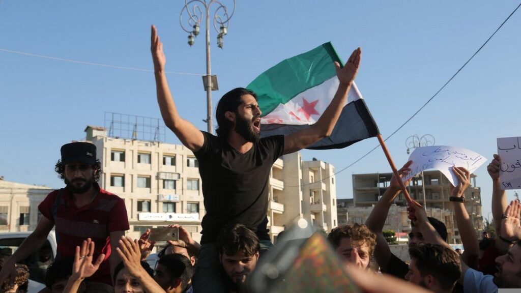 - „Am 15. März versammelten sich Tausende Demonstranten auf dem zentralen Platz der Stadt Idlib, um den dreizehnten Jahrestag des syrischen Aufstands zu begehen, und skandierten ‘Das Volk will den Sturz von Al-Joulani’, womit sie den ikonischen Slogan des ‘Arabischen Frühlings’ wiederbelebten (Orient XXI, 25. April 2024).